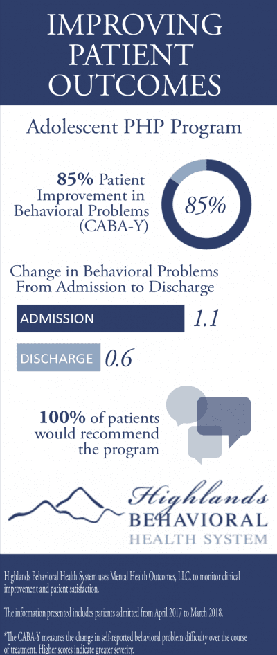 Summit is Highlands Behavioral Health System’s partial hospitalization program, often called PHP. This program is for adolescents and serves individuals dealing with mental and emotional disorders. It may be an alternate option when conventional outpatient therapy is not sufficient or for those transitioning out of inpatient care. Summit allows patients to receive structured treatment during the day through several hours of therapy and skill building groups. Treatment includes cognitive-behavioral therapy and development of coping strategies in a supportive recovery environment.